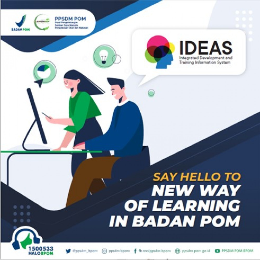 Bismillahirohmannirohmin, dengan niat untuk memudahkan pegawai BPOM dalam belajar, PPSDM POM tahun ini (2021) meluncurkan aplikasi IDEAS (Integrated Development and Training Information System) sebagai platform pembelajaran online terintegrasi yang mengantarkan BPOM pada era baru pembelajaran (new learning culture). Dengan fitur utama Pelatihan Tidak Terjadwal / Online Shopping Training dan Webinar/Diskusi Online, IDEAS hadir untuk mendukung pegawai belajar kapanpun dan dimanapun dengan data hasil pembelajaran tercatat sebagai capaian pembelajaran dan dihitung JP-nya pada siasn.pom.go.id. Ikhtiar kecil ini merupakan upaya untuk membangun learning ecosystem mewujudkan BPOM sebagai learning organization sekaligus transformasi pengembangan kompetensi BPOM menuju BPOM Digital Corporate University dengan pilar utama implementasi Knowledge Management (SIMPONI) dan Learning Management Systmen terintegrasi (IDEAS) Silahkan semua pegawai memanfaatkan IDEAS pada https://ppsdm.pom.go.id/ideas sebagai salah satu media pembelajaran mandiri, untuk bersama-sama kita tingkatkan performance organisasi BPOM mewujudkan hidup masyakarat Indonesia yang berkualitas dengan hanya mengkonsumsi obat dan makanan yang aman, berkhasiat, dan bermutu.