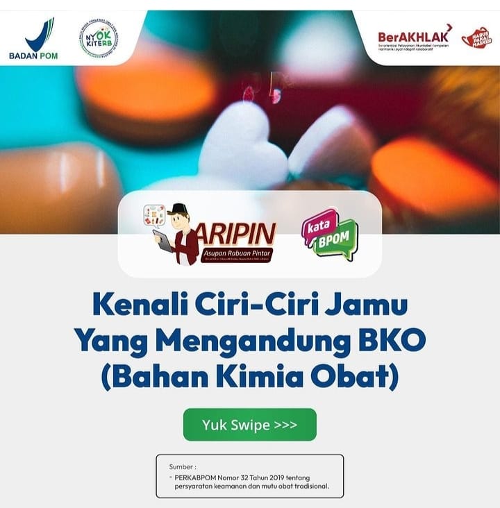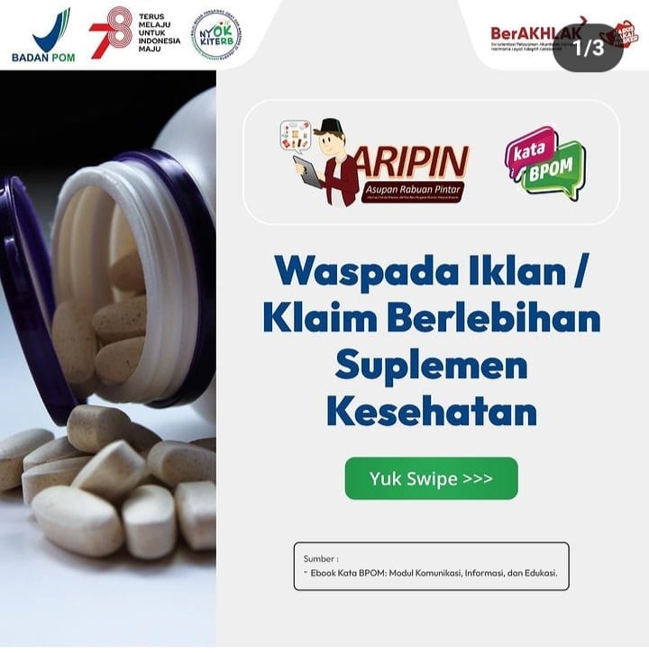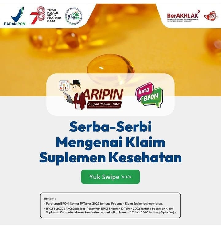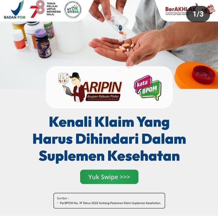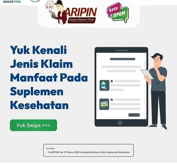 Halo Abang Mpok...Bertemu kembali dengan Aripin. kali ini kita akan membahas mengenai klaim yang harus dihindari dalam Suplemen Kesehatan. Dengan semakin maraknya peredaran suplemen kesehatan, potensi adanya overclaim dan overuse yang dapat beresiko terhadap kesehatan juga dapat meningkat. Kita perlu mengetahui klaim dari suplemen Kesehatan yang harus dihindari, sehingga kita dapat terhindar dari risiko keamanan dan kesehatan. -