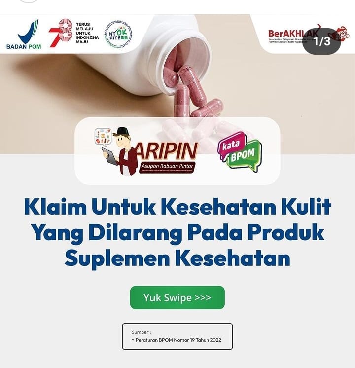 Halo Abang Mpok... Bertemu kembali dengan Aripin. Kali ini kita akan membahas mengenai klaim untuk kesehatan kulit yang dilarang pada produk suplemen kesehatan. Suplemen kesehatan dilarang membuat klaim yang membingungkan (misleading), tidak jelas dan tidak benar. Klaim juga tidak boleh dihubungkan dengan kondisi performa / penampilan. Untuk lebih jelas, Nyok kite simak same - same info dari Aripin kali ini. -