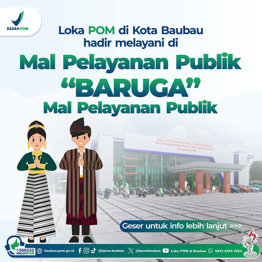 MAL PELAYANAN PUBLIK BARUGA KOTA BAUBAU Hai #SahabatBPOMBaubau kami juga hadir dan melayani di Mal Pelayanan Publik Baruga Kota Baubau lho. Pelayanan kami lakukan setiap hari, untuk lokasi, jadwal dan jenis layanan dapat disimak langsung pada informasi berikut. #BPOMRI #LokaPOMdiKotaBaubau #MalPelayananPublik -