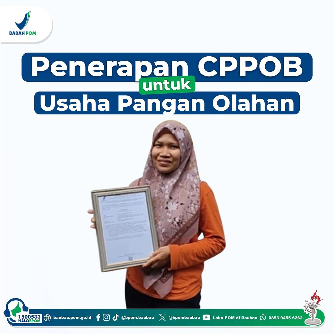 PENERAPAN CPPOB UNTUK USAHA PANGAN OLAHAN #SahabatBPOMBaubau Badan POM terus melakukan berbagai upaya untuk mendukung pengembangan IKM/ UMKM khususnya pada komoditi Obat dan Makanan. Pada kesempatan ini, Loka POM di Kota Baubau sebagai salah satu Unit Pelaksana Teknis (UPT) Badan POM, melakukan pendampingan terhadap salah satu pelaku usaha di Kab. Wakatobi hingga mampu mendapatkan Sertifikat Cara Produksi Pangan Olahan yang Baik (CPPOB). Dengan adanya sertifikat tersebut, tentunya akan mempermudah pelaku usaha untuk segera memperoleh Nomor Izin Edar untuk produknya. #BPOMRI #LokaPOMdiKotaBaubau #CPPOB -