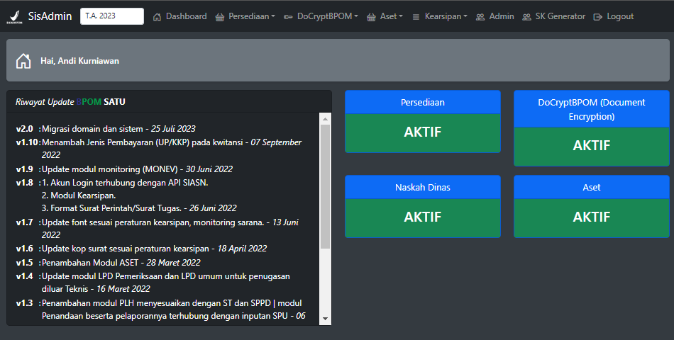 Tools untuk menunjang pengelolaan administrasi dalam lingkup Pembuatan Naskah Dinas, Pengelolaan Persediaan dan BMN yang terintegrasi dengan API SIASN BPOM. -